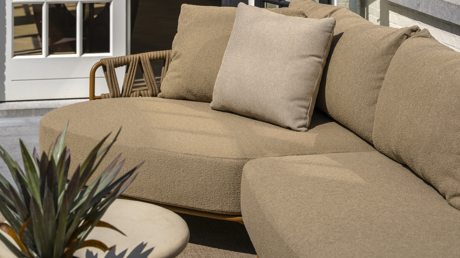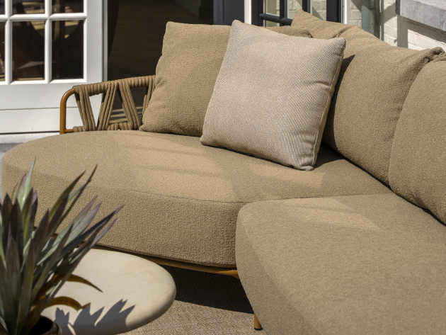 De Biaritz loungeset heeft een stevig aluminium frame in de warme Amberkleur, afgewerkt met luchtig rope vlechtwerk. De all weather kussens met zachte bouclé stof maken het zitten nóg meer comfortabel. Daarnaast zijn ze eenvoudig schoon te houden. Dankzij het modulaire ontwerp kun je de opstelling van de loungeset volledig aanpassen aan jouw tuin of terras.