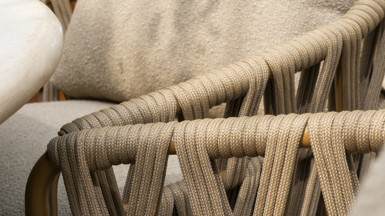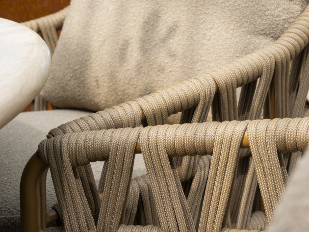 | Materialen | Aluminium frame met rope vlechtwerk en bouclé stoffen. Tafel beton ciré |