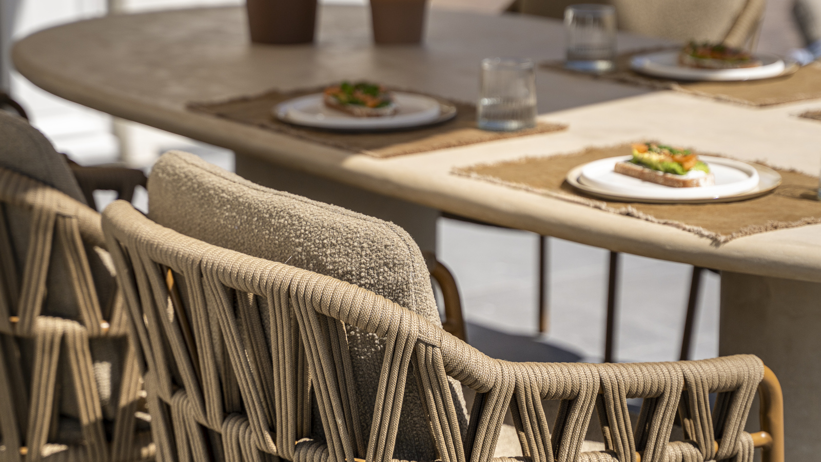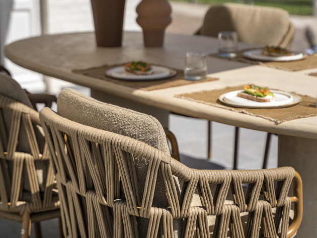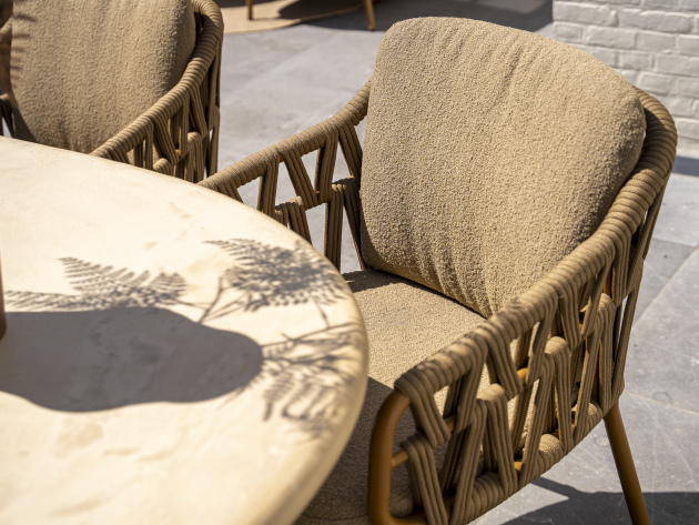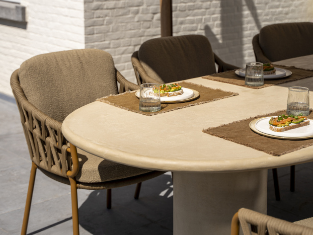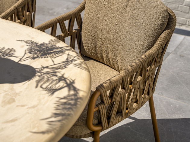 De Biaritz diningstoelen zijn ontworpen met een aluminium frame in de nieuwe Amberkleur. Het rope vlechtwerk geeft de stoelen een moderne en luchtige uitstraling, terwijl de zachte all weather kussens met bouclé afwerking zorgen voor heerlijk zitvorming. In combinatie met de Colorado eettafel heb je prachtige buitenmeubels in het bezit. Met zijn royale ovaal keramische tafelblad van 204 x 105 cm biedt de tafel voldoende ruimte voor familie en vrienden. De twee cilindervormige tafelpoten van aluminium in dezelfde Amberkleur maken van dit meubelstuk een echte eyecatcher. Precies wat je zoekt in een luxe tuinset.