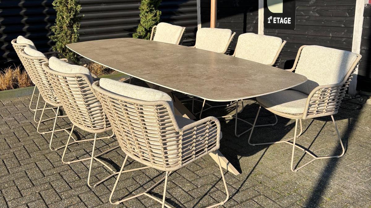 De Fabrice en Prado diningset bestaat uit een een keramische tafel en 8 diningstoelen.