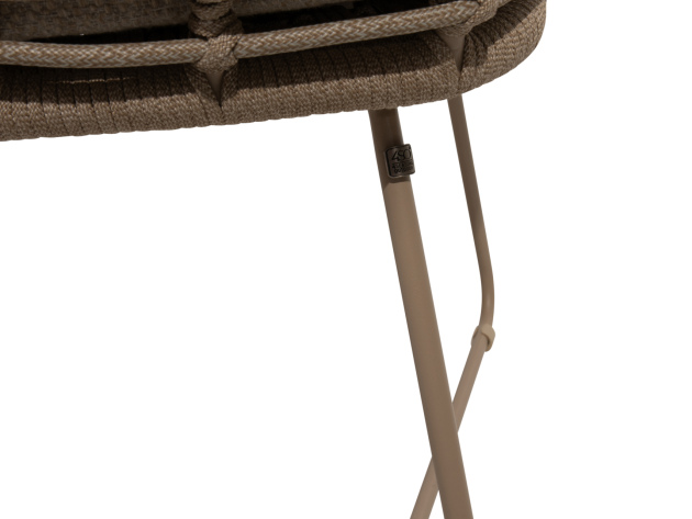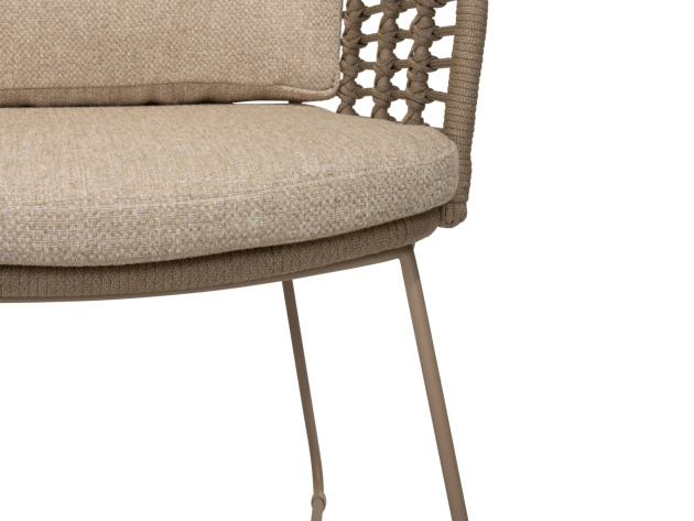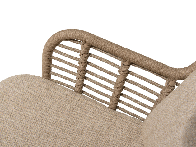 De zittingen van de stoelen zijn van rope gemaakt. Rope is geknoopt touw met een kern van kunststof (polypropyleen) en een buitenlaag van Olefin-stof. Olefin-stof heeft als kenmerk dat het water-, vuil- en vetafstotend is, waardoor je loungeset in goede staat blijft. Daarnaast heeft Olefin-stof een hoge UV-bescherming en wordt het materiaal niet warm in de zon.