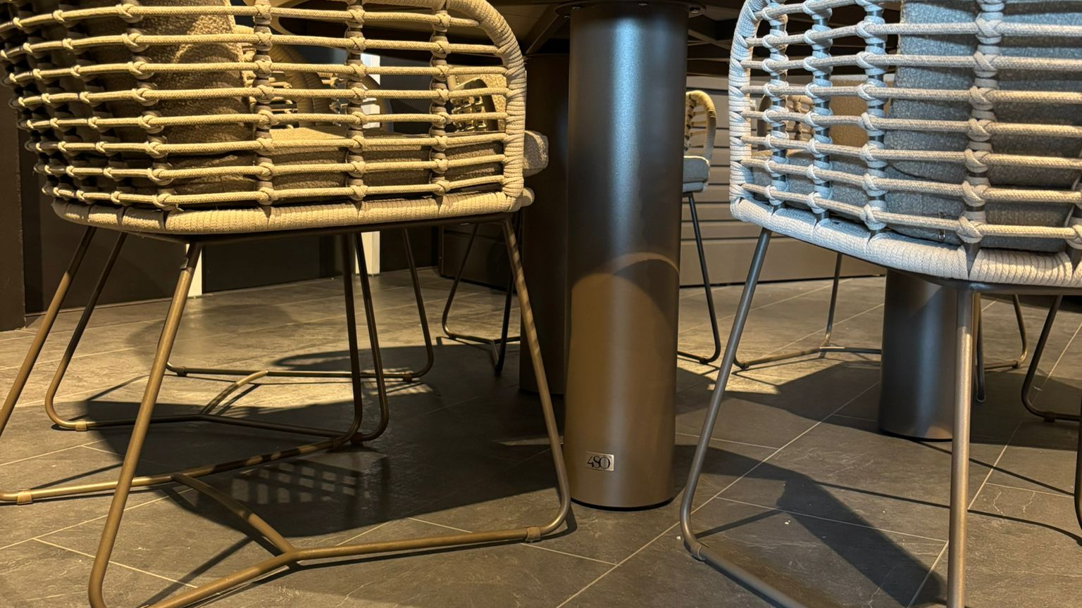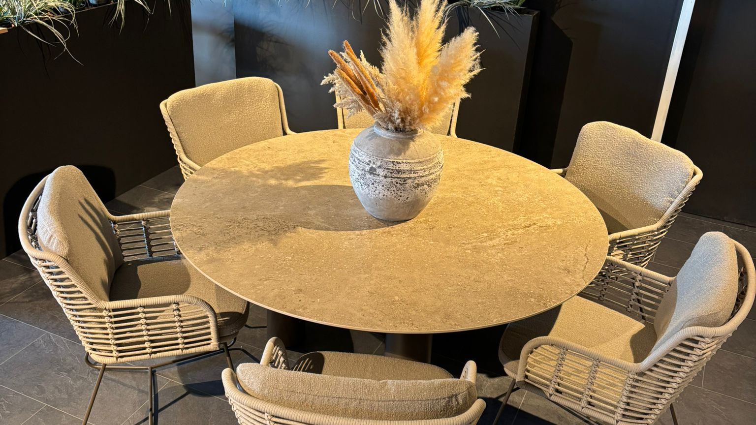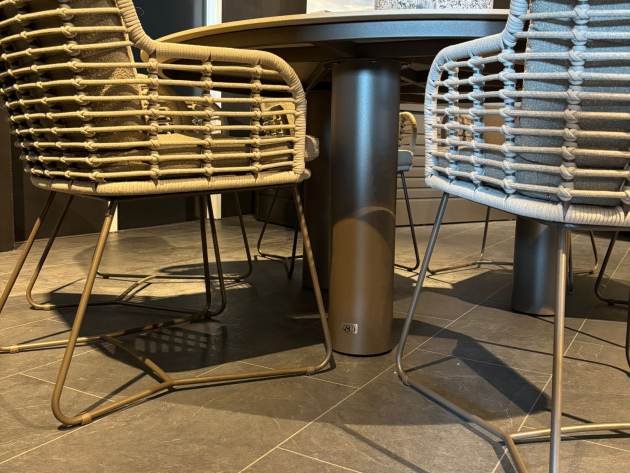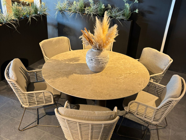 Het middelpunt van de tuinset is de ronde Arizona eettafel met een keramisch tafelblad van 160 cm doorsnede. Het blad is stijlvol en slijtvast, ideaal voor intensief gebruik buiten. In combinatie met de drie cilindervormige tafelpoten in RVS, wordt deze set een echte eyecatcher.