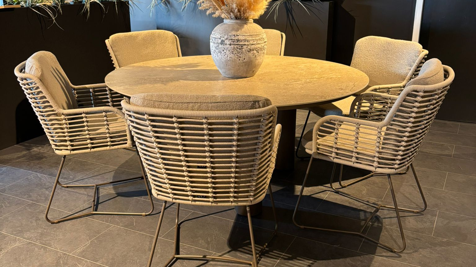 | Materialen | RVS, Rope, Bouclé-Olefin kussens, tafel keramiek en RVS |