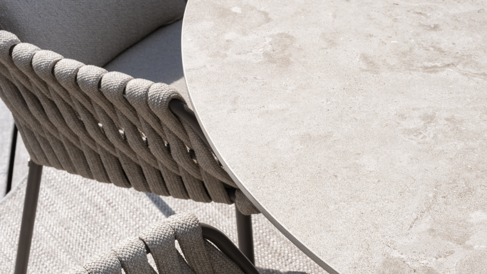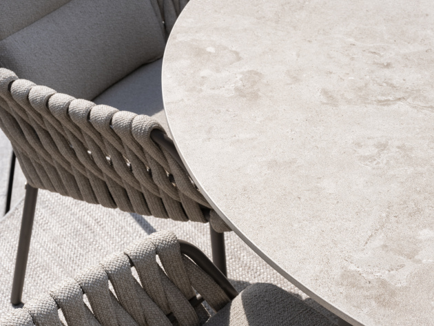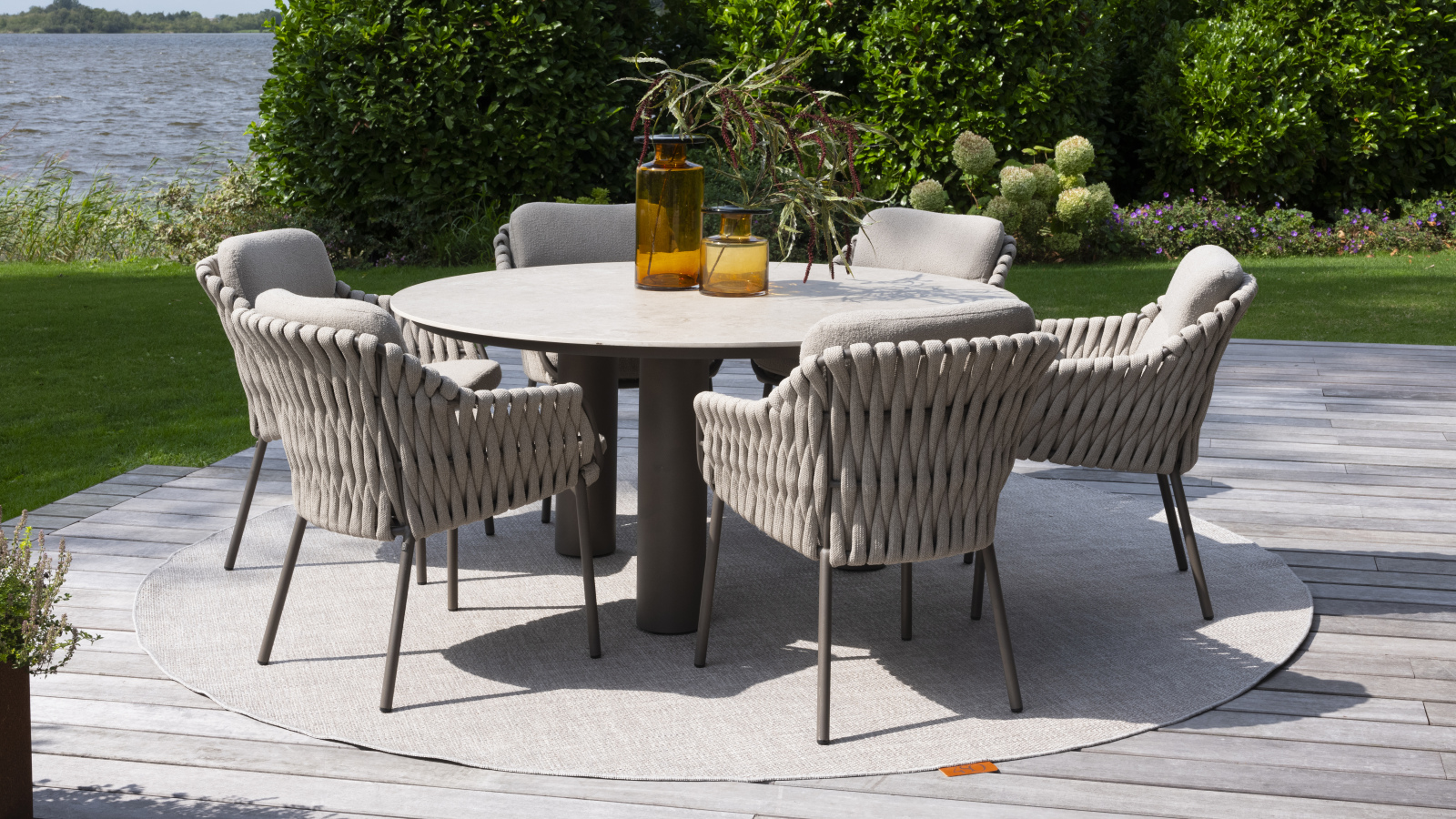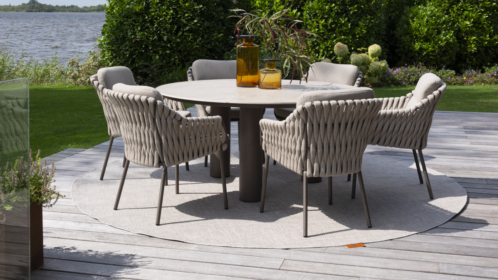 Het middelpunt van de tuinset is de ronde Arizona eettafel met een keramisch tafelblad van 160 cm doorsnede. Het blad is stijlvol en slijtvast, ideaal voor intensief gebruik buiten. In combinatie met de drie cilindervormige tafelpoten in RVS, wordt deze set een echte eyecatcher.
